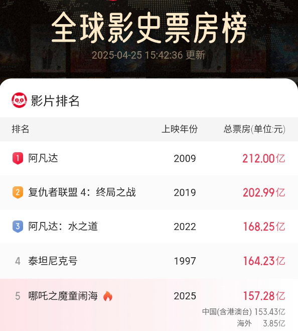 而今,《哪吒2》虽然通过票房补录而使得自己的全球总票房突破了157亿人民币,但是和位列第四名的《泰坦尼克号》之间的差距,却还有7亿人民币。