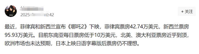 另外,海外一些国家即使还在放映《哪吒2》,但由于该片已经上映许久,且热度早已大不如前,因而它的日票房成绩也不是很高,每天进账就只有几十万美元。